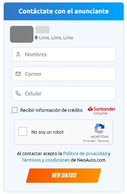 Marca la casilla "Recibir información de crédito" si estás interesado en recibir información adicional para un crédito vehicular por Santander Consumer Perú.